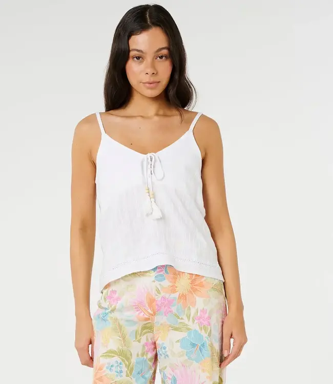 Delicate details, coastal style. The Catalina Island Cami features a cotton-viscose blend with self-knotted tassels and crochet trim. A feminine summer staple.