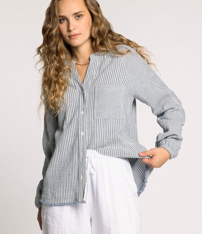 The Maia Shirt in Blue/Ivory by Thread & Supply is an easygoing essential with beachy texture and a relaxed feel. Made from 100% cotton, this striped button-down features a flattering v-neckline, dual chest pockets, and raw hem detail for that lived-in look we love.