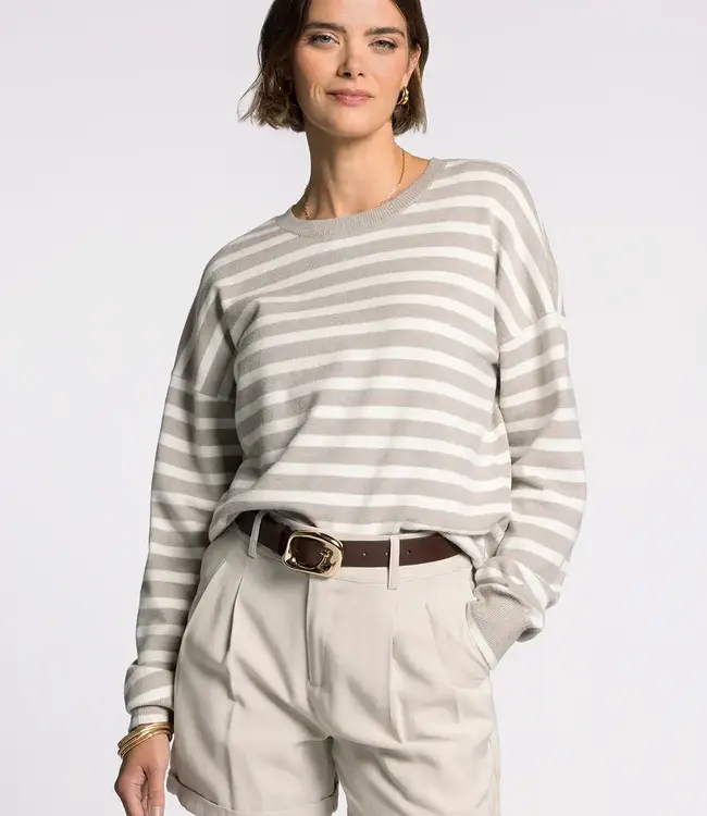 Meet the Preston Sweater in Ivory/Taupe by Thread & Supply—a relaxed striped pullover with effortless, everyday appeal. Designed with a classic crew neckline and laid-back drop shoulders, this sweater pairs just as easily with jeans and sneakers as it does with lounge pants on slow mornings.