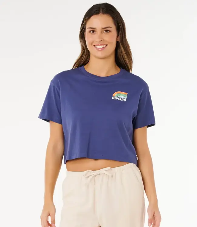 A fresh twist on a classic tee — the Rip Curl Surf Side Cropped Tee in Navy brings relaxed comfort with a trendy cropped silhouette and signature Rip Curl branding. Designed with a crew neckline and soft knit fabric, this tee hits just right at the waist for effortless pairing with high-rise denim, shorts, or skirts.